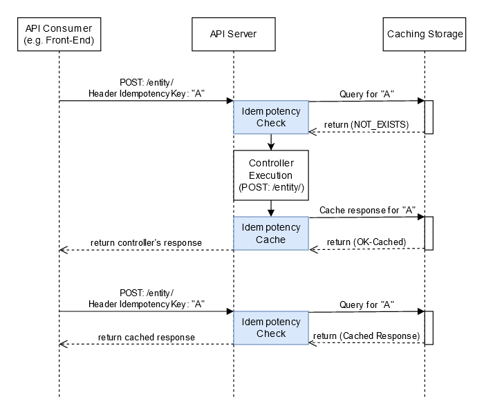 IdempotentAPI flow for two exact POST requests. In this example, a customer requests the creation of a resource that presents a unique client request identifier. On receiving the request, the service first checks to see if it has seen this identifier before. If it has not, it starts to process the request. It creates and stores an idempotent “session” for this request keyed off the customer identifier and their unique client request identifier. If a subsequent request is received from the same customer with the same unique client request identifier, then the service knows it has already seen this request and can take appropriate action.
